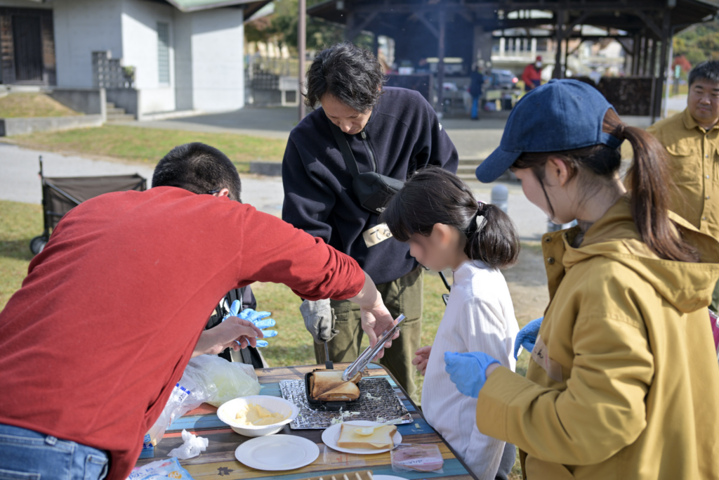 昼食は、クラフトコンロを使ったバーベキューと、ホットサンドづくりを行いました。子どもたちは班ごとに分かれ、火を起こし、食材を準備し、自分たちで調理を進めました。
