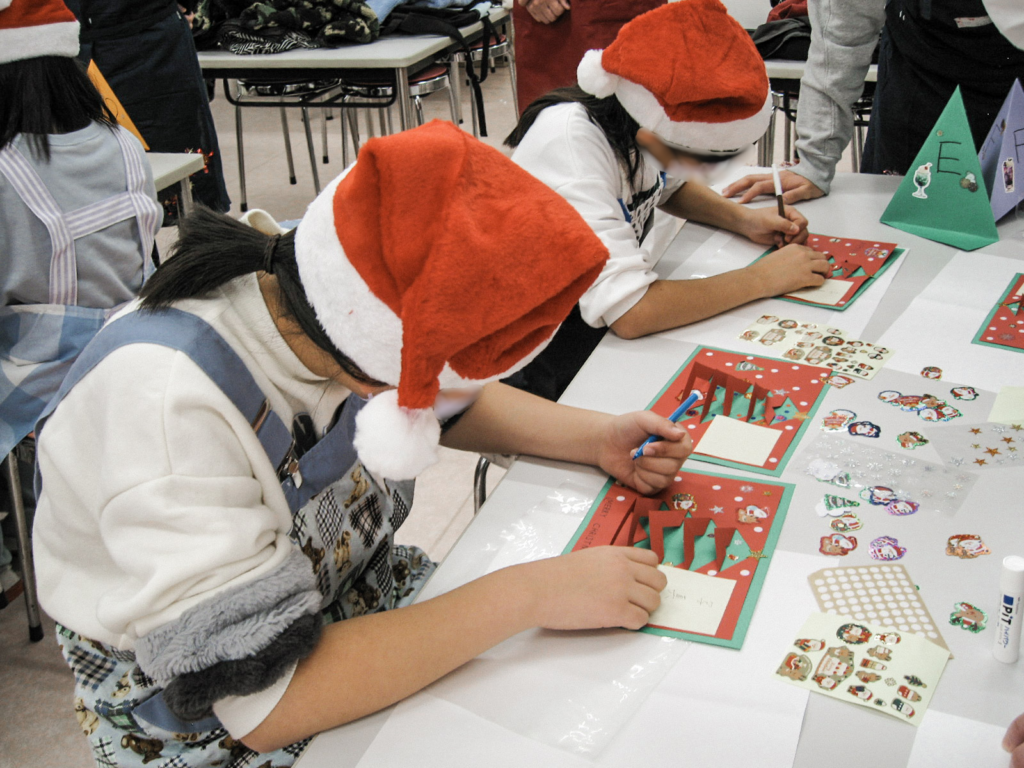 当日は、クリスマスケーキ作りとクリスマスカード作り、ミニクリスマス会を実施しました。安全面では、焼き上がった生地に触れてやけどをしてしまった前年度の反省を踏まえ、オーブンに入れてから冷めるまでの時間を使ってカード作りを行いました。