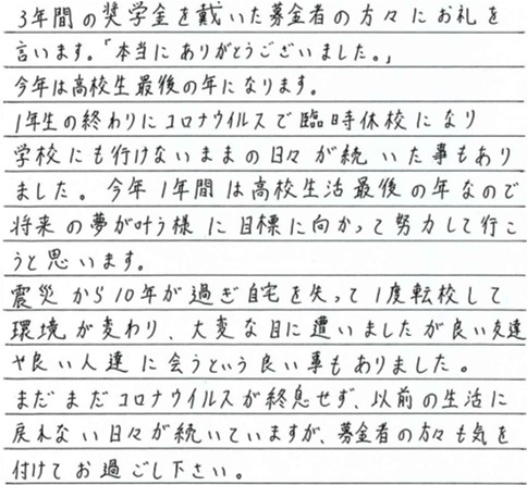 ユネスコ協会就学支援奨学金は、東日本大震災によって経済状況が悪化したご家庭の中学3年生を対象とした返還不要の奨学金です。