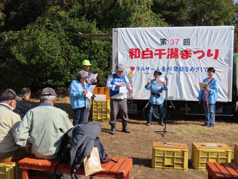 第37回和白干潟まつりはお天気が良くて、約480名の参加でした。子どもたちが多く参加していて、嬉しかったです。今秋はなかなか寒くならずに、越冬のカモたちもまだ少なめですが、ミヤコドリは多く過去最高羽数の41羽になりました。