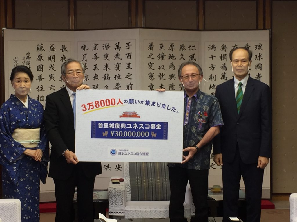 日本ユネスコ協会連盟は、2019年10月31日の火災により焼失した首里城(※1)の復興支援に向け、翌日の2019年11月1日~2020年10月31日までの期間「首里城復興ユネスコ募金」を設置し、募金を受け付けました。本募金では、Yahoo!ネット募金も実施し、多くの皆さまにご協力いただきました。寄付総額は10月23日時点で3896万926円、その全額を沖縄県および一般財団法人沖縄美ら島財団に贈呈します。(※2)