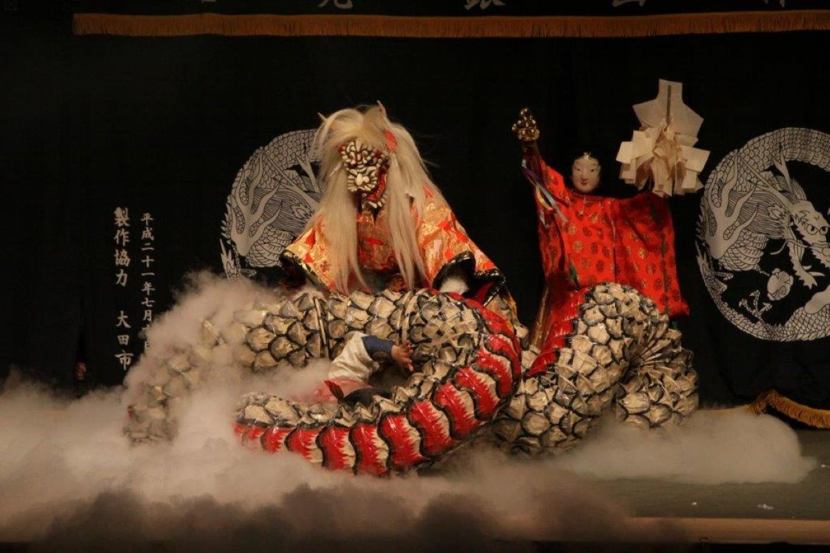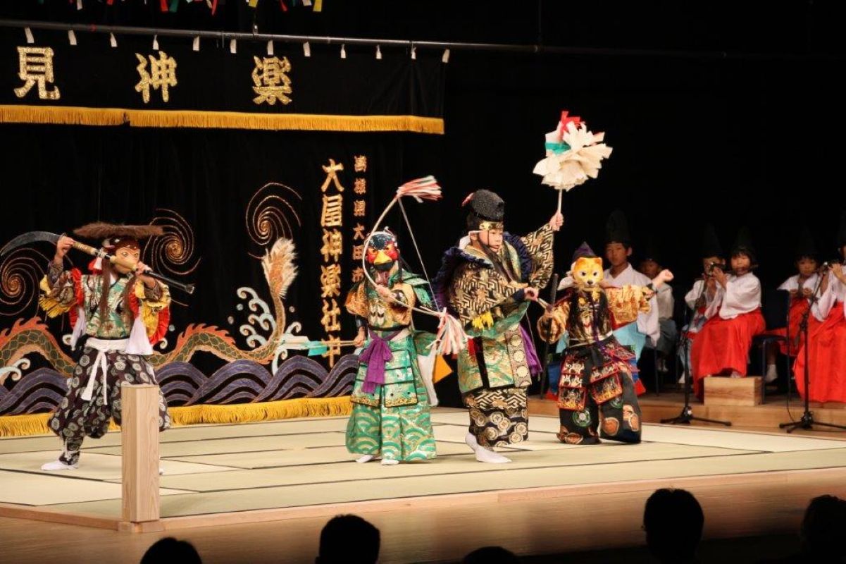 土江地区に伝わる約300年以上の歴史があるとされる子ども神楽。歳神が祀られた仮の社に集う「仮屋行事」という大田地方の正月行事の中で、集落の子どもたちが大人たちに成長する姿を披露するために舞われていた。