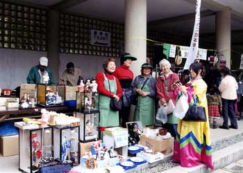 | 平山郁夫会長はじめ会員や市民からの献品、とくに外国人参詣客に人気の日本人形を蒐めてのコーナーは注目の的。 日本の伝統芸術を映す博多人形、木目込人形など、高級品から次々に売れていき、外国人の目の高さに売り子も驚く。 |