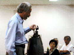 梵鐘の魅力と歴史 八幡先生は50年近く梵鐘の勉強をしてこられたと聞く。研究ではなく勉強とおっしゃるところが、インドから鎌倉まで、梵鐘を実地主義で検証された先生のお人柄だ。 2週間後の「平和の鐘を鳴らそう」実施にあたって「サロン」での講演をお願いしたことをうけて、鐘を打つ意味が重要と、「梵鐘の音はお釈迦様の説法として響いてくる」と説明される。 過去・現在・未来の三世の無情、苦、空、無我を昇華して「自」の悟りだけでなく「他」の救済をも願う大乗の心はまさに「平和の鐘を鳴らそう」にも通じるものがあるのではと。 身近でみることができる建長寺、円覚寺、東慶寺、常楽寺等の梵鐘は東国の武家文化を語っている。 梵鐘のルーツをたどると、平家物語等でも知られている、インドの祇園精舎の鐘ということになる。梵語では鐘は音を発する小さな楽器という意味で「けんち」といわれていた。それが大乗仏教の東遷に伴い、仏を荘厳する聖なる音として中国の古代の楽器と結合して梵鐘なったという。6世紀初頭の龍門石窟にある釈迦涅槃図に中国鐘のレリーフを八幡先生が発見されたとのお話もあった。 中国鐘と朝鮮鐘、日本鐘の形、紋様、竜頭、吊り方等の違いについても、用意された豊富な資料とスライドによる説明で興味深くおおいに学ぶところがあった。 |