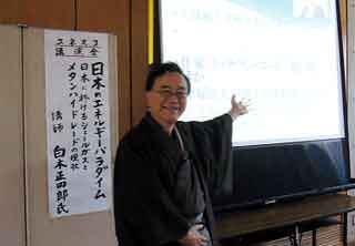 中国の動向、新エネルギーの動向、シェールガス、メタンハイドレートの平和貢献等、正しい見識を持って、マスコミの報道を判別し、見るべき物を見、見るべきでない物を見ない。全てあなた次第ですよ、と強調された。 (神澤)