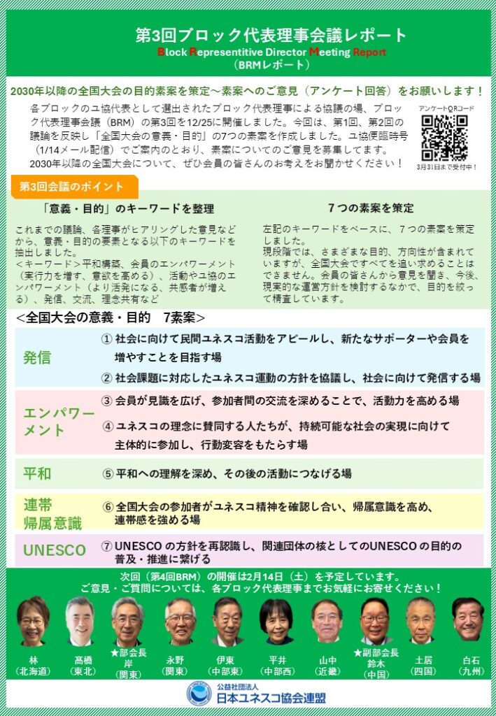 12月25日に開催した第3回ブロック代表理事会議(BRM)では、これまでの議論を反映し「全国大会の意義・目的」の7つの素案を作成しました。現在、素案についてのご意見を募集しています(詳しくは1/14配信のユネスコ協会便臨時号参照)。