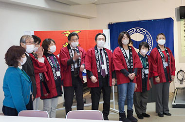 揃いのユネスコ法被で歓迎する仙台ユネスコ協会の役員