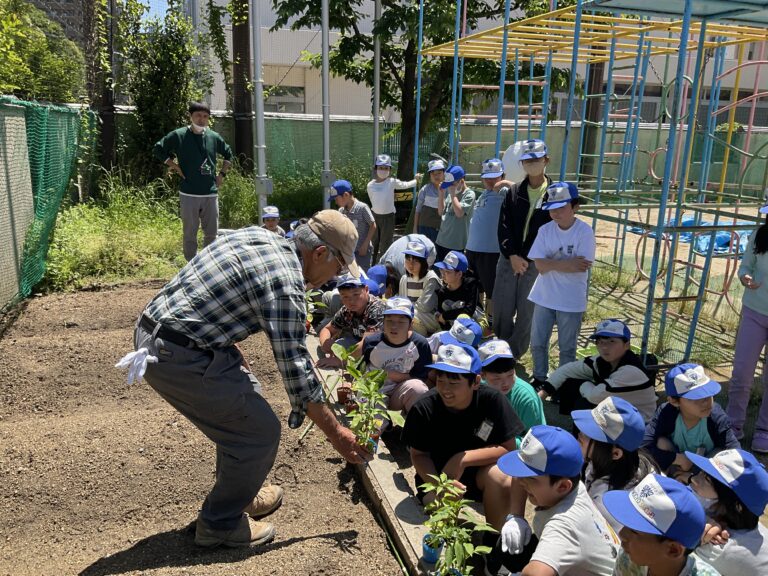 5年生では「京野菜プロジェクト」として京都府農政課や地域の方々と連携し、様々な京野菜を育て、調理しておもてなしをする活動を行っている。また、調べた京野菜について保護者や地域の方々、ゲストティーチャーを招き、発表会をしている。そのような活動を通じて発信する力を伸ばすことを目的としている。