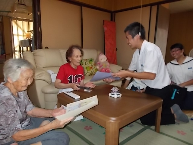 3年生は高齢者宅を訪問し、事前に作成した絵手紙をプレゼントし、交流する活動を行った。