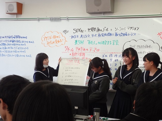 プロの講師のワークショップを受けることで、ほとんどSDGsについて知らなかった生徒たちがその特徴や内容を理解できた。SDGsについて学び、自分たちに何ができるか考えることで自分自身が持続可能な未来を創る主体者であることに気づき、普段の生活の中でもできることを探すようになった。持続可能な未来を創っている自分がどのような生き方をしているか、将来(2030年の自分)について具体的なイメージを持って考えられるようになった。ワークショップやワールドカフェなどの活動を通じて、積極的に自分の意見を発言し、活発に議論を行えるようになった。