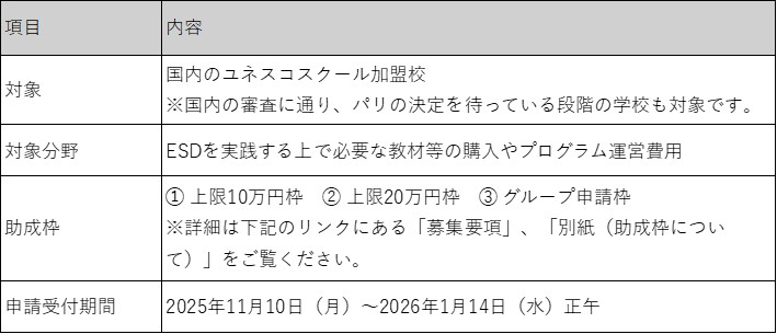 公益社団法人日本ユネスコ協会連盟は、株式会社三菱UFJ銀行のご協力のもと、「持続可能な開発のための教育(ESD)」を実践するユネスコスクールを対象に今年度も活動費用を助成します。概要と申請方法は下記のとおりです。募集説明会もあわせて開催しますので、ご関心のある学校はぜひご参加ください。